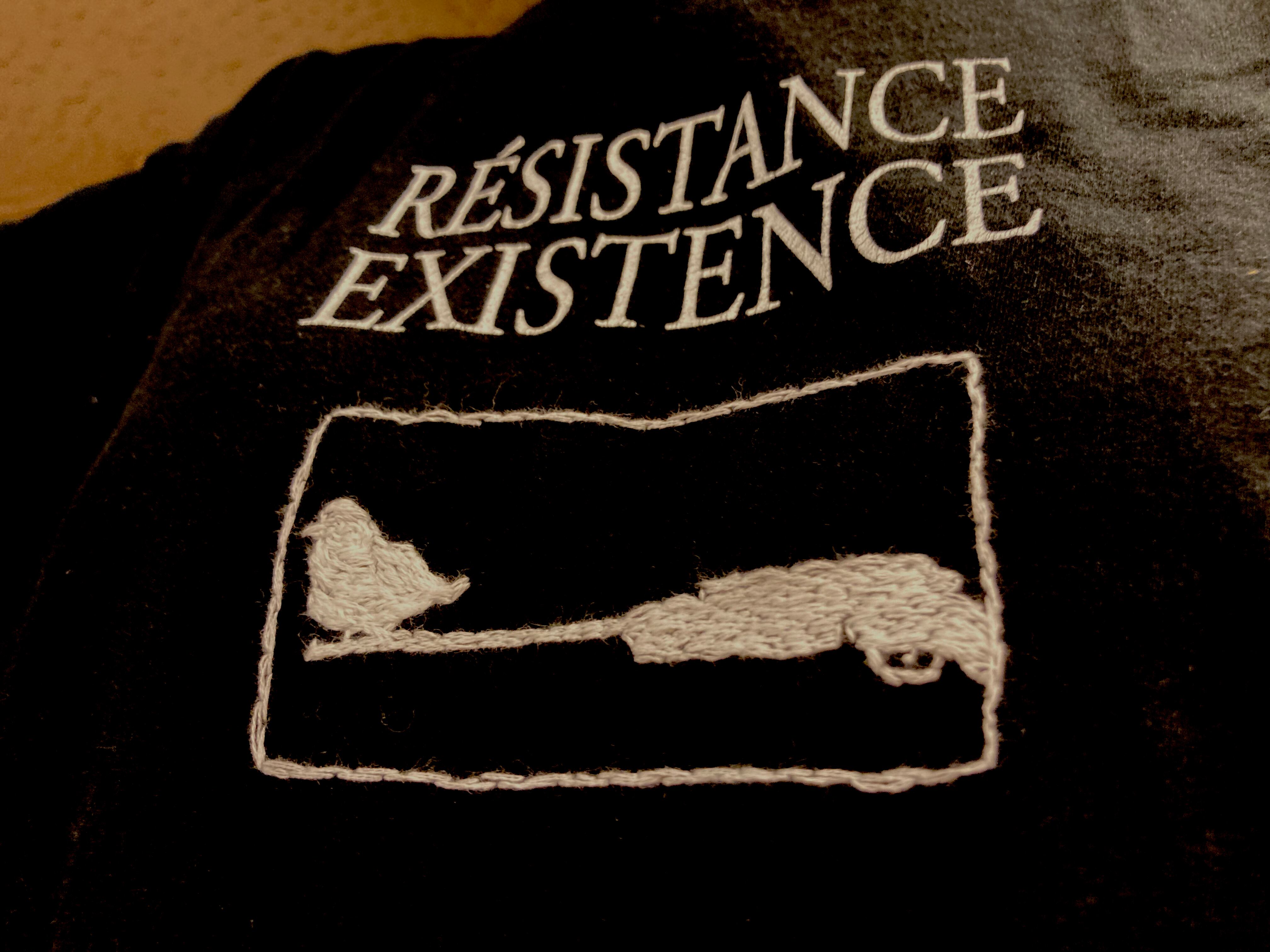 「抵抗/存在」とプリントされたagnes b.の古着Tシャツに刺繍しました。